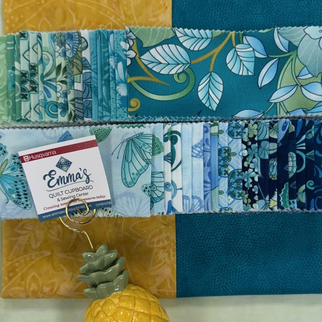 This vibrant bundle features a refreshing palette of ocean blues, jade greens, golden sunshine, and soft sky tones—all tied together with whimsical butterflies, leafy botanicals, and lush tropical motifs. From soft watercolor washes to crisp, intricate prints, each fabric has been handpicked to create a stunning quilt full of movement and surprise.